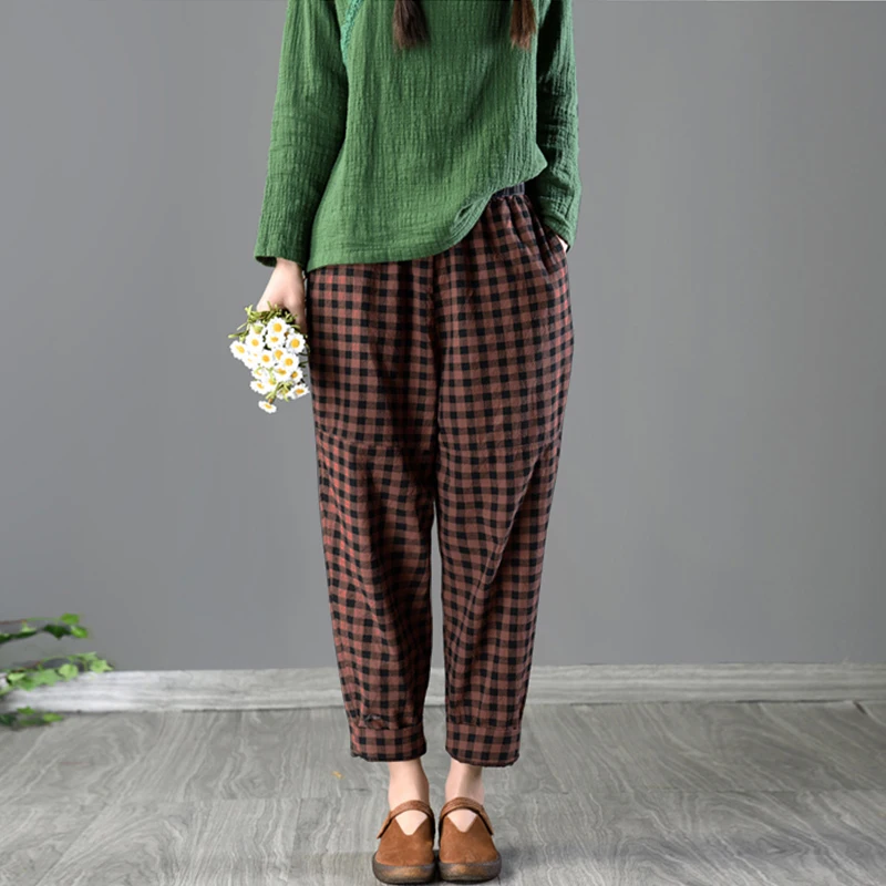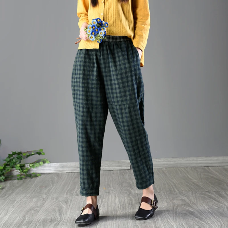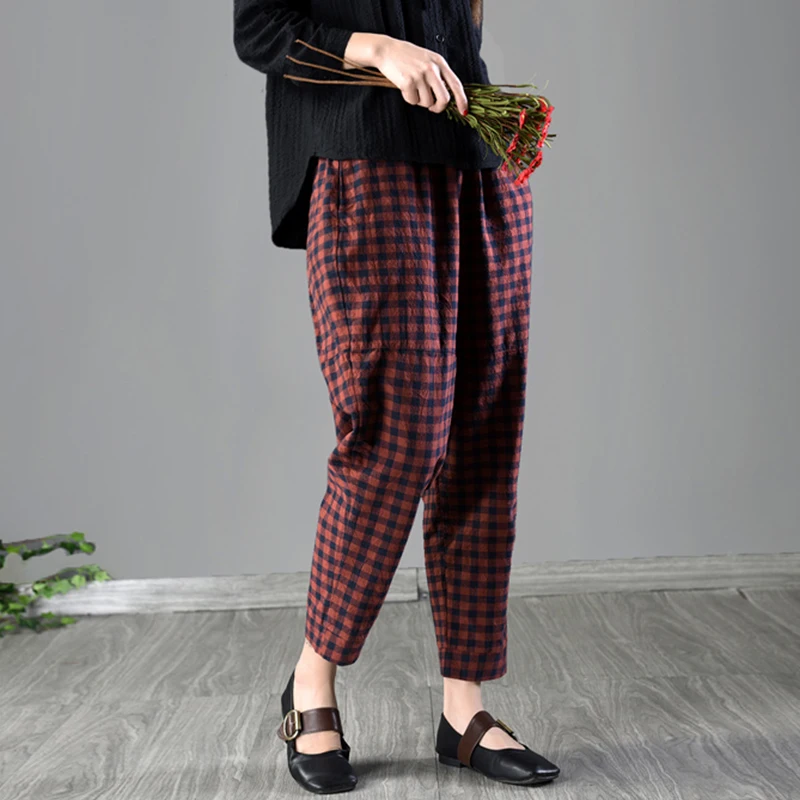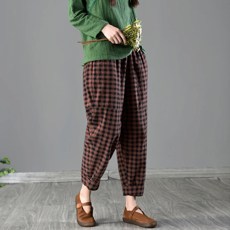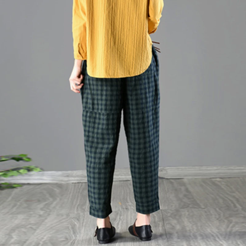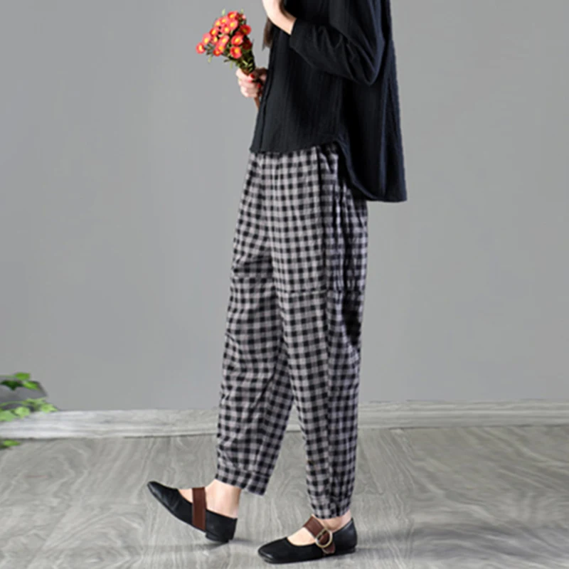ZANZEA 2018 Baggy OL Turnip Pantalon Women Casual Vintage High Waist Pockets Check Plaid Cotton Linen Long Trousers Harem Pants