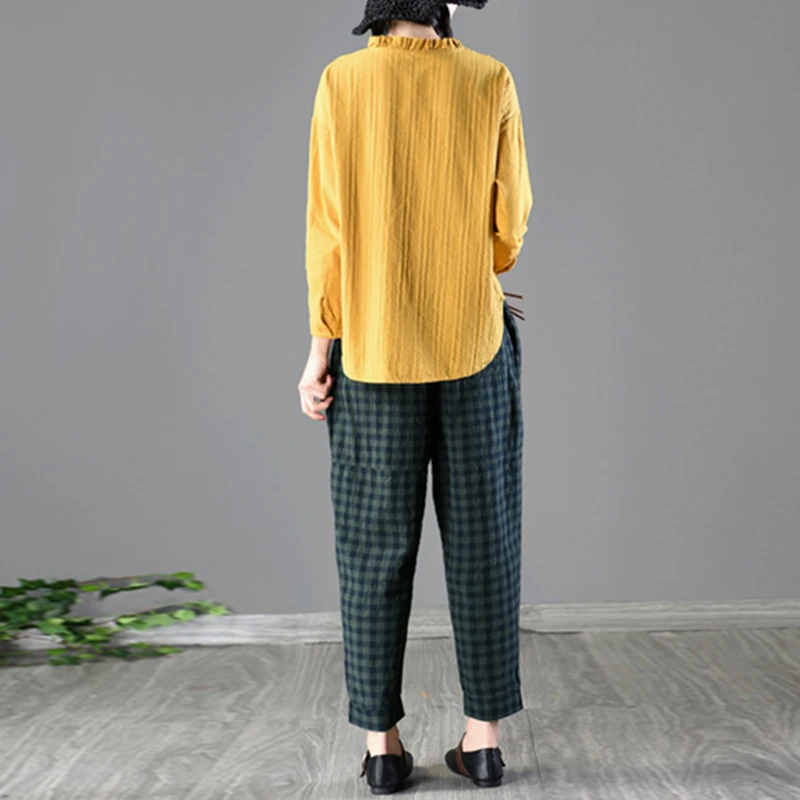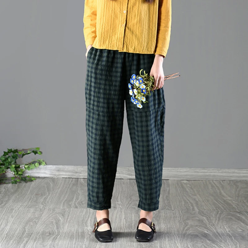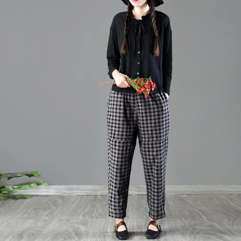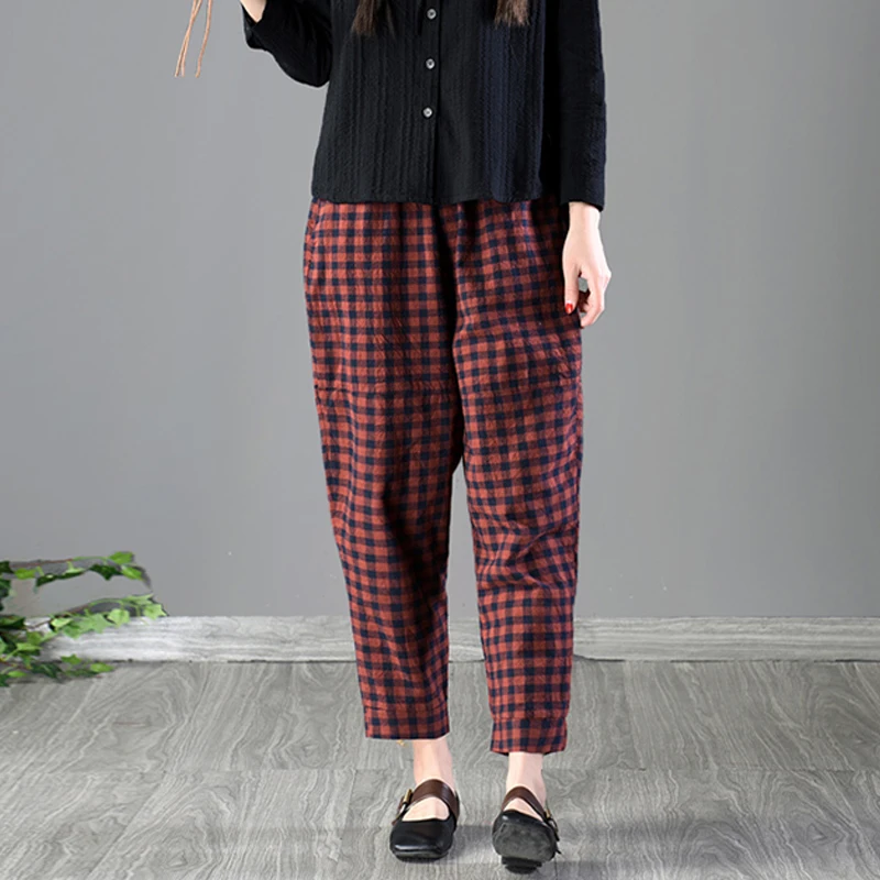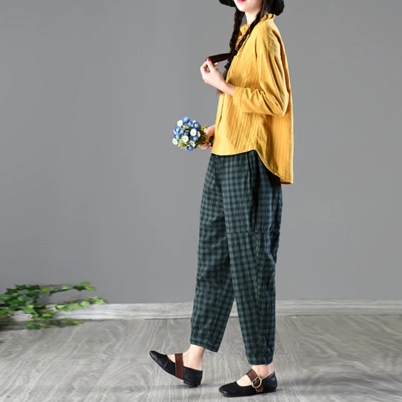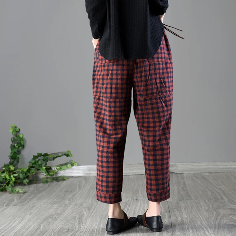 ZANZEA 2018 Baggy OL Turnip Pantalon Women Casual Vintage High Waist Pockets Check Plaid Cotton Linen Long Trousers Harem Pants
