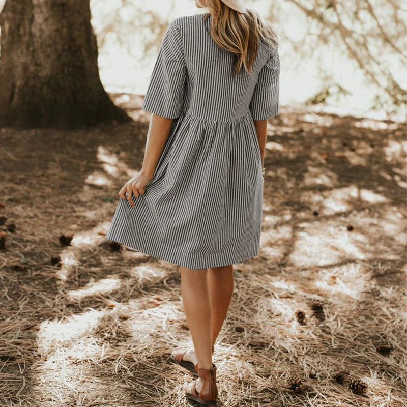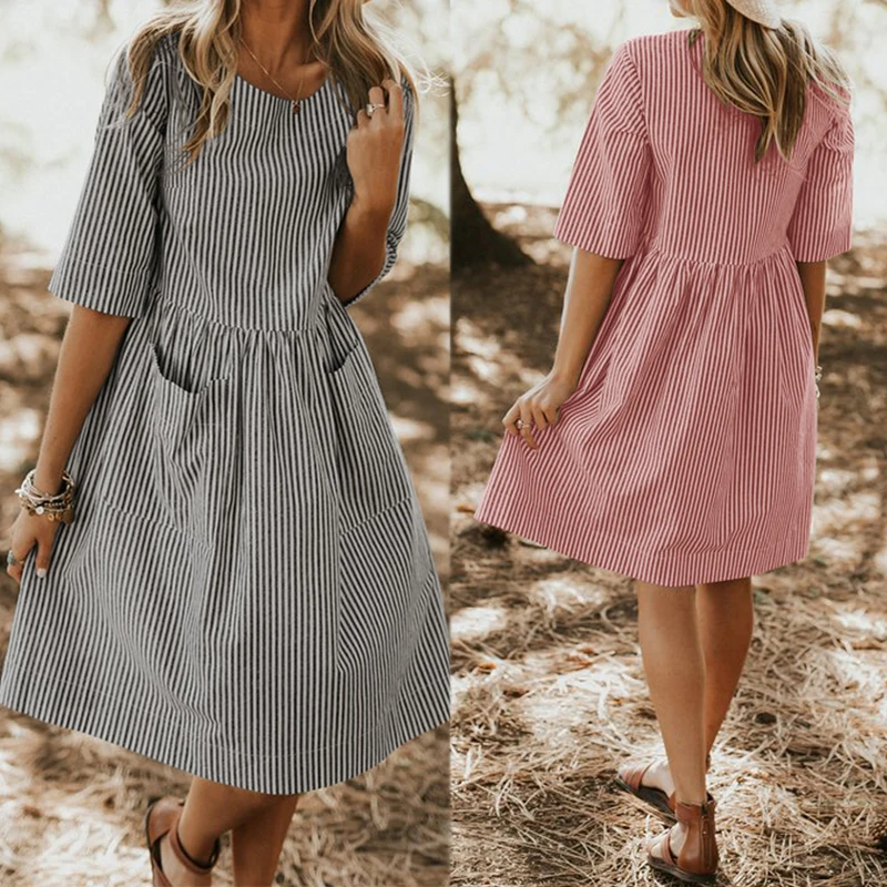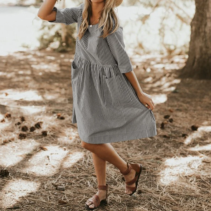 ZANZEA 2018 Summer Women Vintage Striped Dress Female Half Sleeve Pockets Dresses Lady Casual Baggy Sundress Vestido Robe Femme