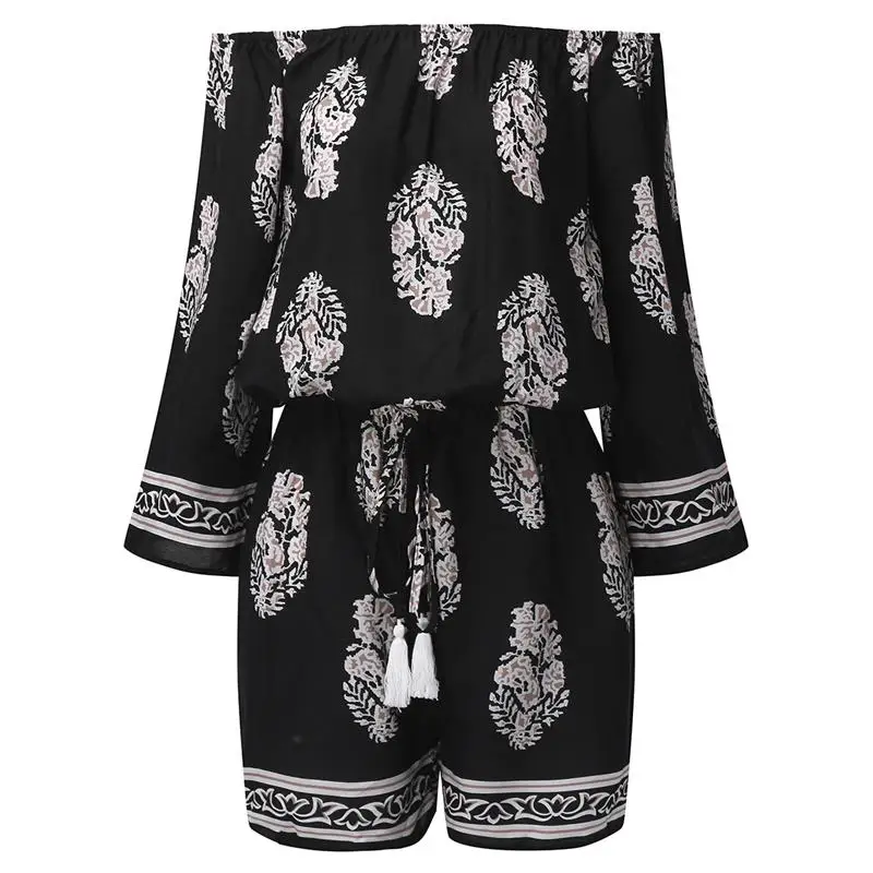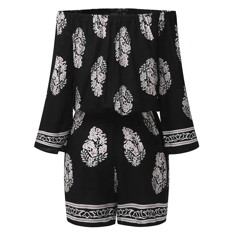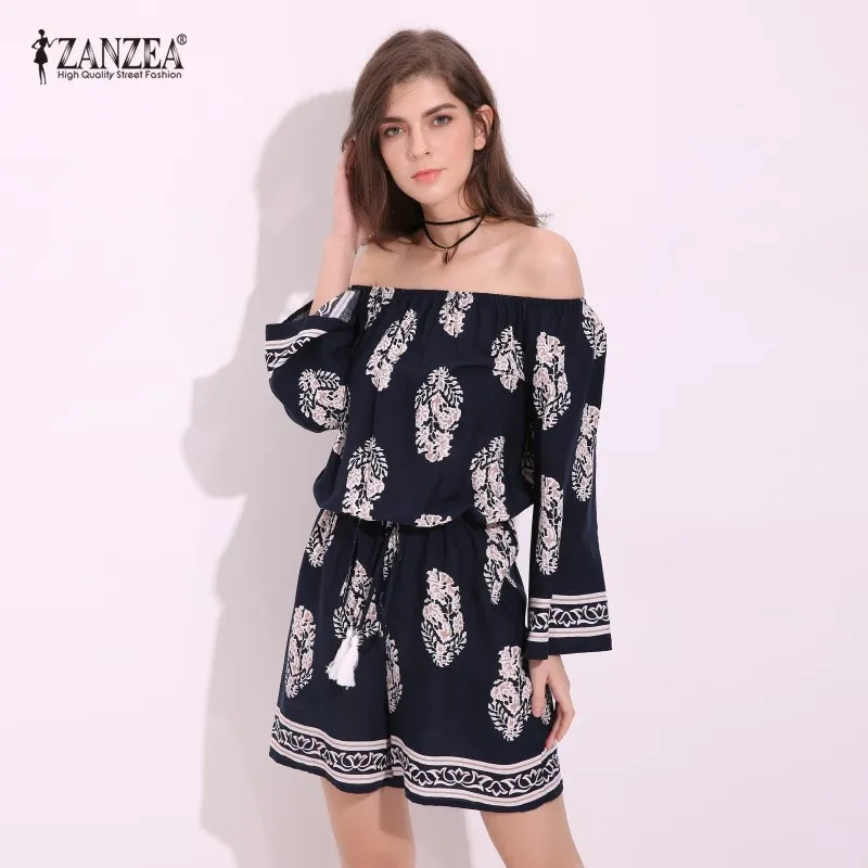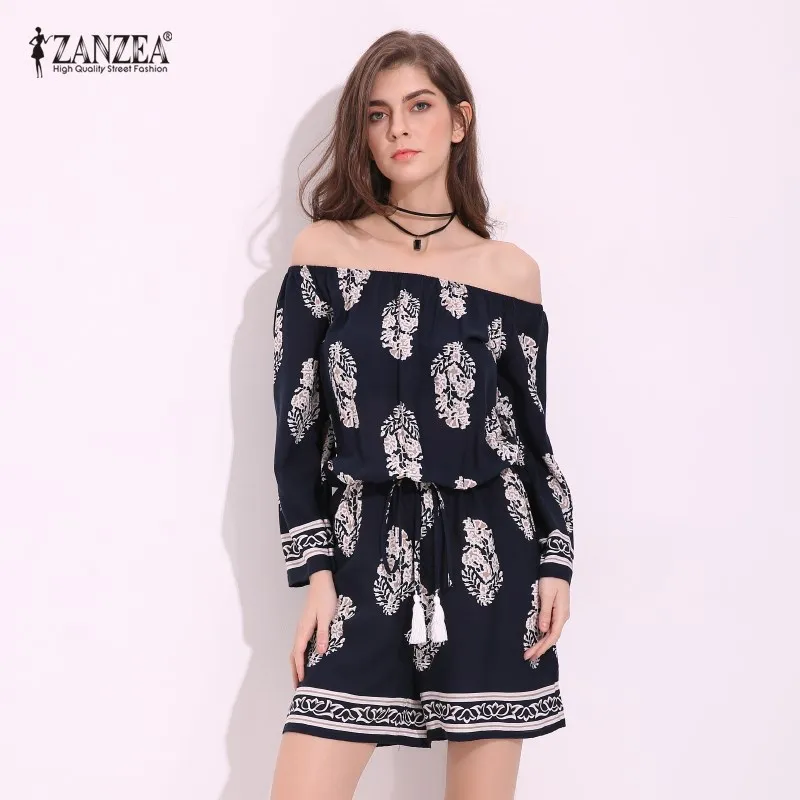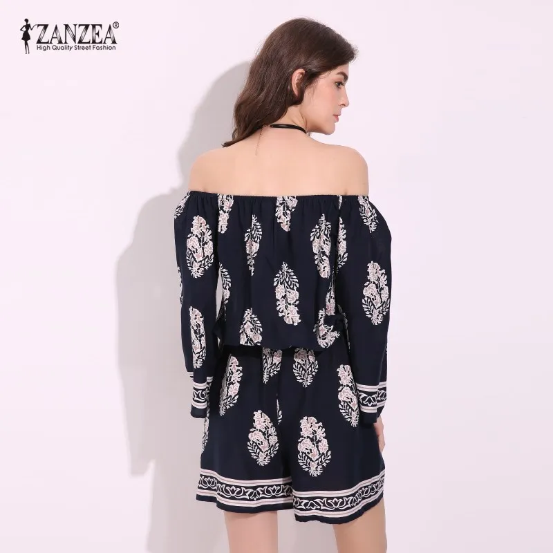 ZANZEA Summer Sexy Slash Neck Off Shoulder Jumpsuit Rayon Long Sleeve Womens Boho Floral Elastic Romper Short Catsuit Playsuits