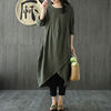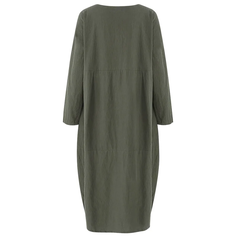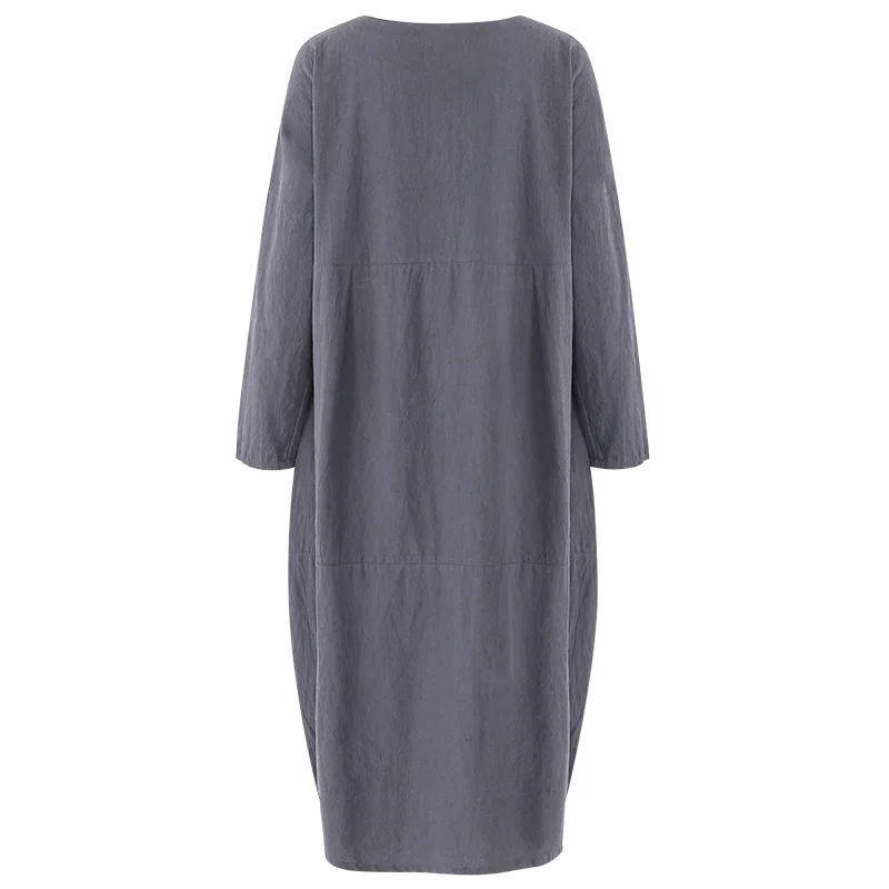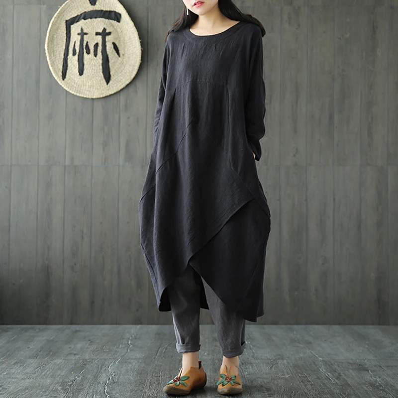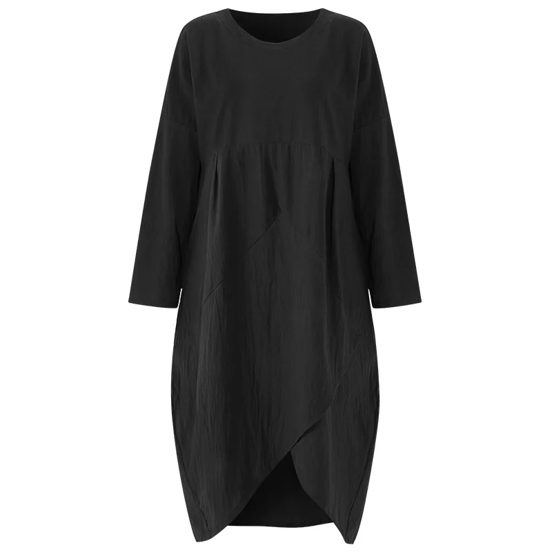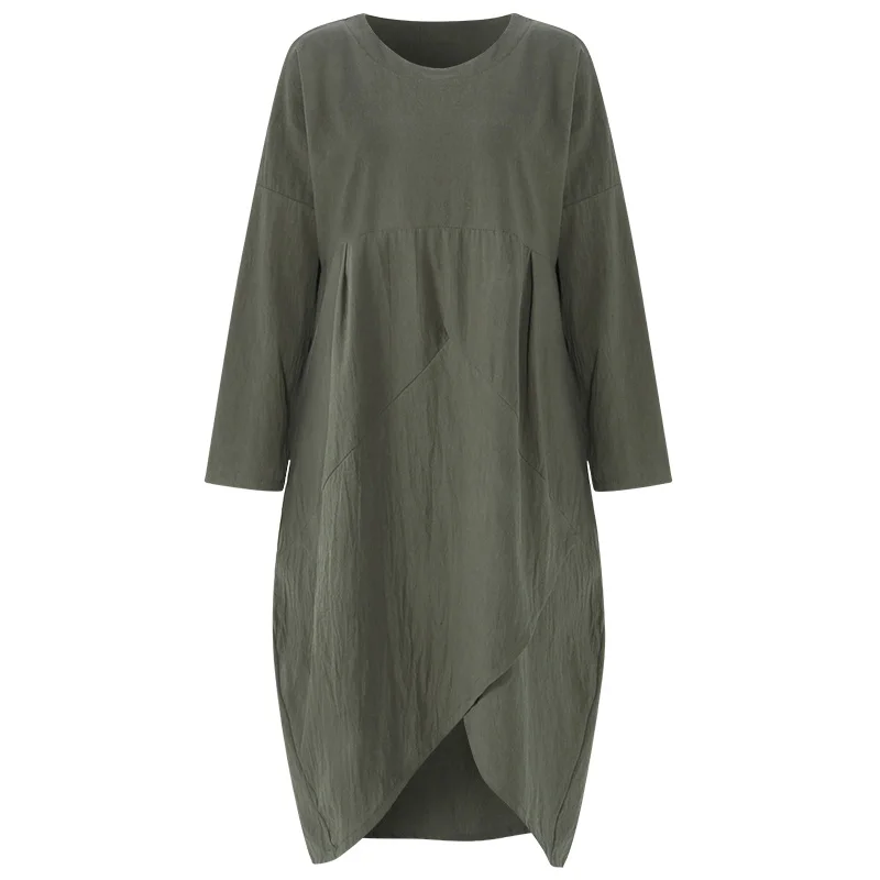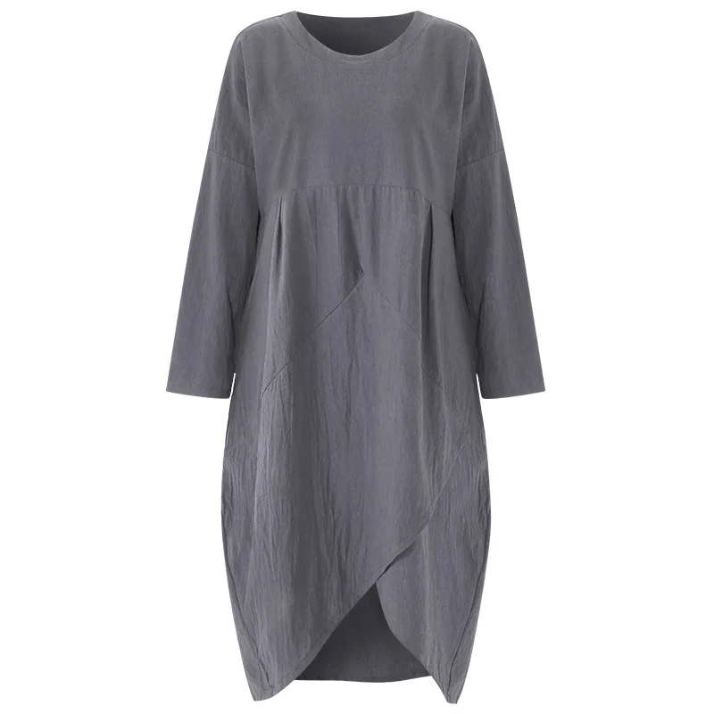 Features:Women Autumn Casual Vintage Cotton Linen Long Sleeve Asymmetrical Hem Dress