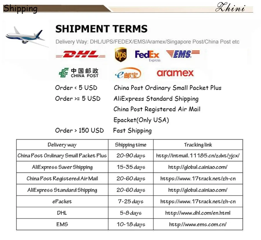 Packages from our warehouse in China will be shipped by ePacket or EMS depending on the weight and size of the product. Packages shipped from our US warehouse are shipped through USPS.
