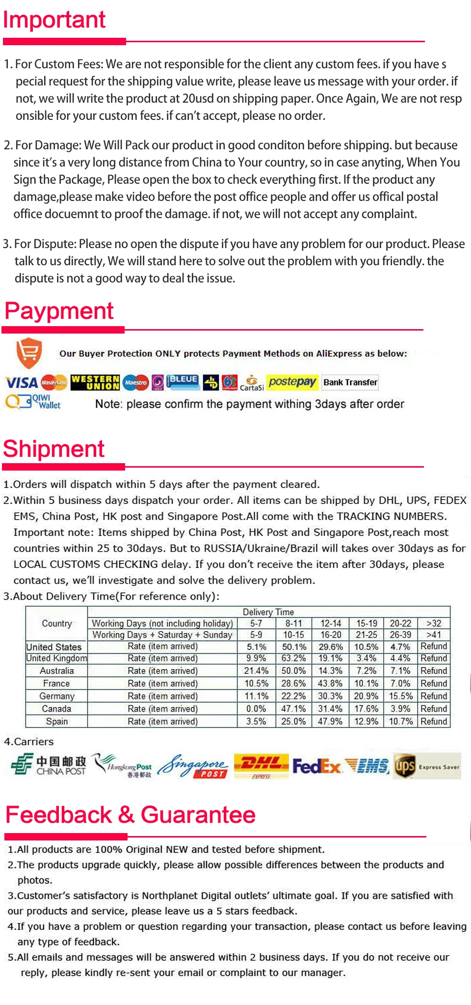 • If you did not receive the product within the guaranteed time( 45 days not including 2-5 day processing) you can request a refund or a reshipment.