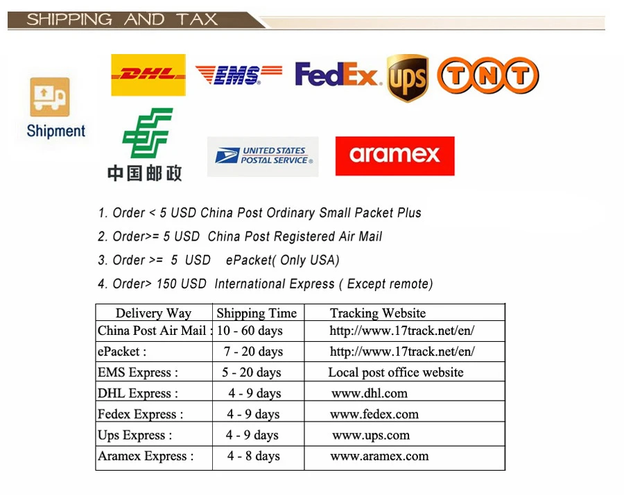 Packages from our warehouse in China will be shipped by ePacket or EMS depending on the weight and size of the product. Packages shipped from our US warehouse are shipped through USPS.